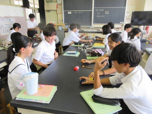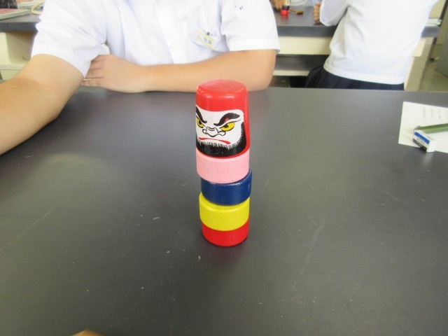 慣性の法則について学習しました。だるま落としで、「静止している物体は、静止し続けようとすること」を、HOVERBALLで、「運動している物体は、等速直線運動をすること」を調べました。みんなで、楽しく勉強できました。