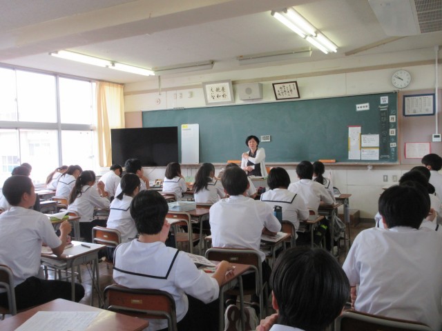 2組は家庭科。来週に予定されている「幼児ふれあい活動」の際、注意すべき点を確認しています。