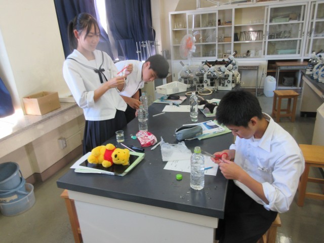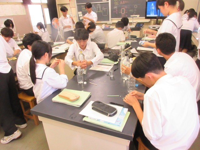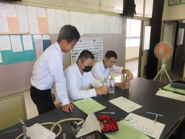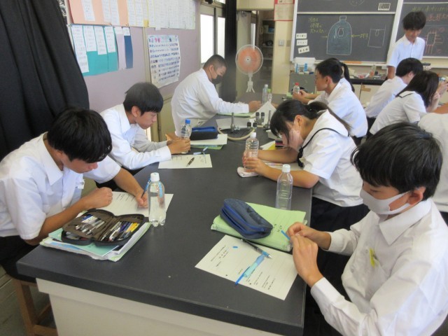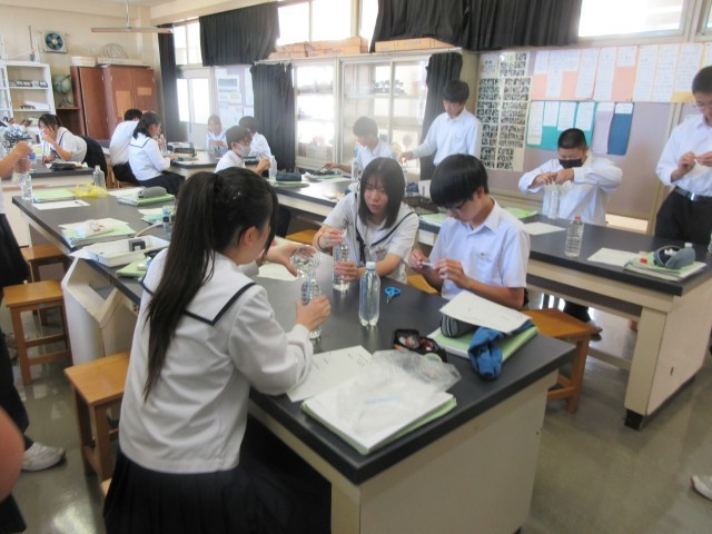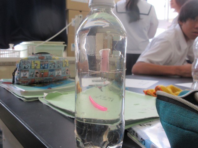 3年理科の様子です。浮沈子を作って、浮力の原理をレポートにまとめました。自分の浮沈子ができた瞬間、生徒たちの笑顔がはじけました。「理科、楽しい~!」という声も上がりました。幼児ふれあい活動に、自作の浮沈子を持って行った生徒もいました。