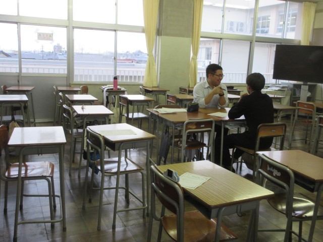 10月27日(月)教育相談風景 公開日 2025/10/27 更新日 2025/10/27 北中NEWS 今週は教育相談週間です。放課後、生徒一人一人と担任が時間を取って懇談します。生徒たちは約束の時間に合わせて、部活動等から教室に戻ってきます。