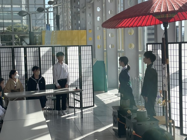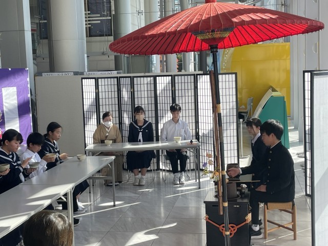 茶道部の生徒たちは、午前中お点前を披露しました。お茶を立てる人を亭主といいます。その亭主の他、亭主を補佐する半東をしっかり務めることができました。また、お客の代表として、亭主と対話をしてお茶席の雰囲気を作る正客の役割もしっかりと果たしていて、昨年、本校勤務だった先生からもお褒めの言葉をいただきました。