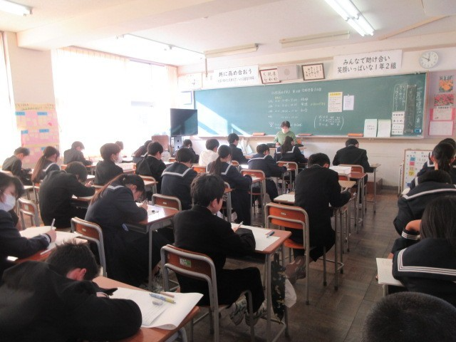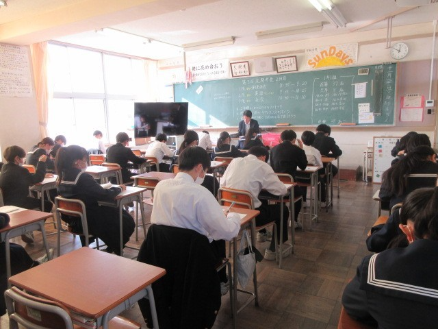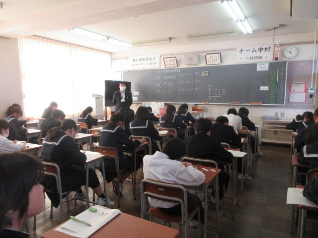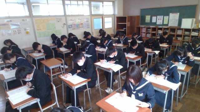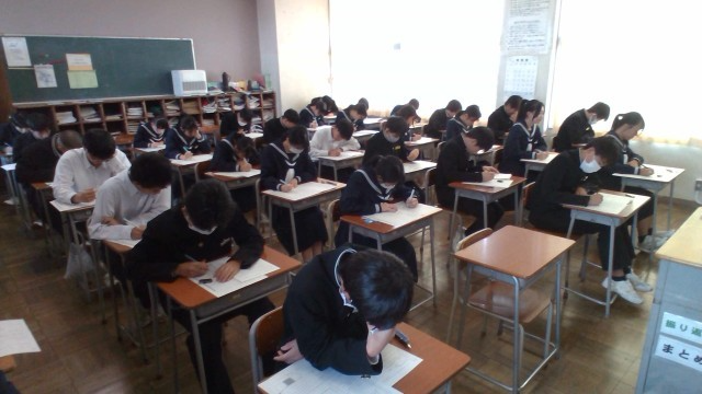第3回定期考査、2日目の様子です。生徒たちは真剣に試験問題に向き合っていました。そして、休み時間も教科書やワークを確認したり、問題を出し合ったりする姿が見られました。明日は最終日です。