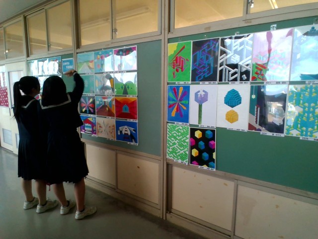 現在、3年教室棟廊下の掲示板には、美術作品が掲示してあります。保護者懇談会の時にぜひご覧ください。