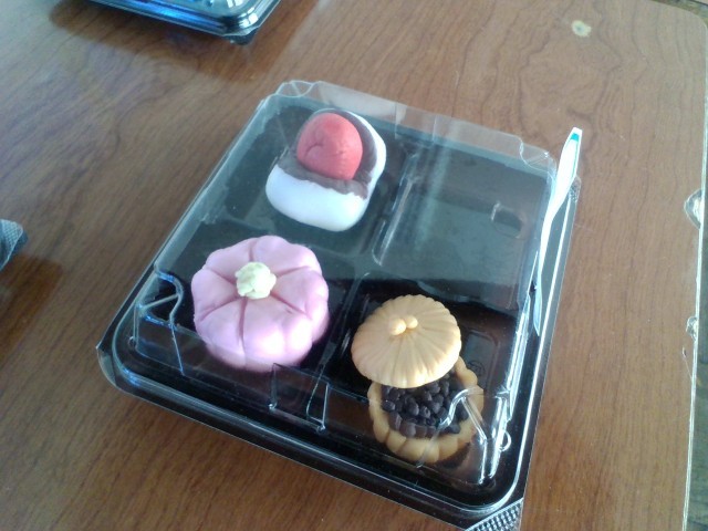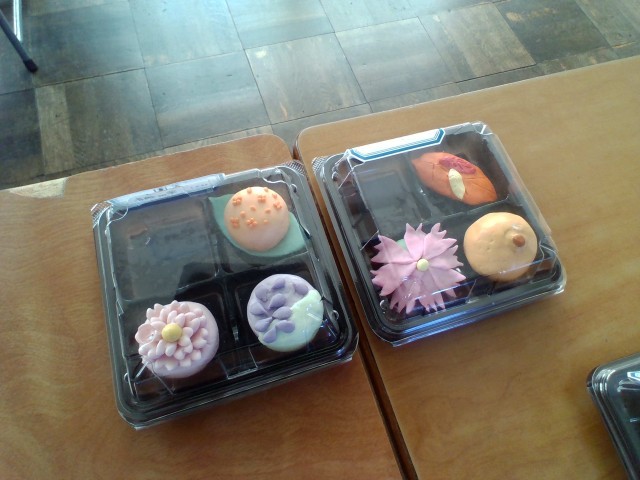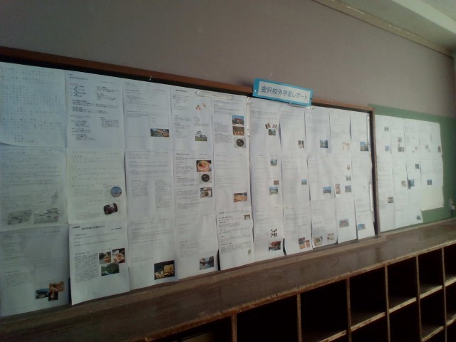 現在、2年教室棟学習室には、美術の授業で制作した和菓子の造形作品の展示と金沢校外学習のレポートの掲示がされています。
