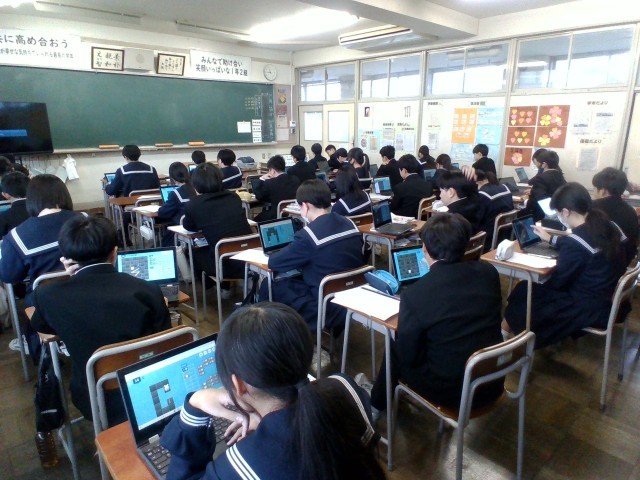 1年技術・家庭科(技術分野)では、情報の技術を学習しています。課題を解決できるような簡単なプログラムをつくっています。生徒たちは試行錯誤を繰り返しながら課題に挑戦していました。