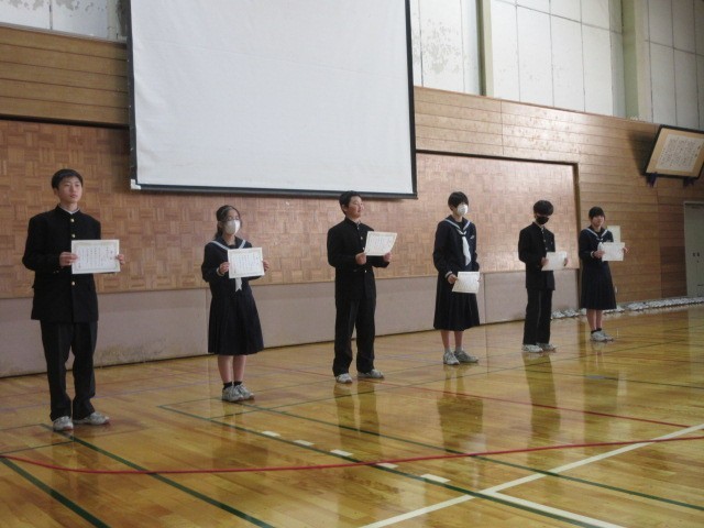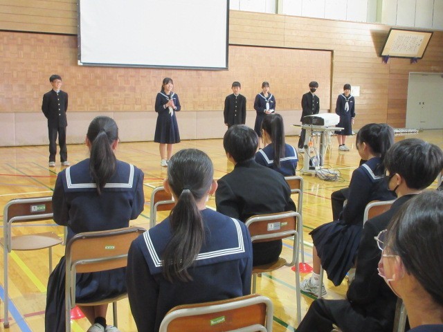 最初に級長たちが、2学期を振り返って、よかったことや改善していきたいことを発表しました。また学級から選ばれたMVPの表彰も行いました。MVPは各クラス投票で2名ずつ選ばれています。