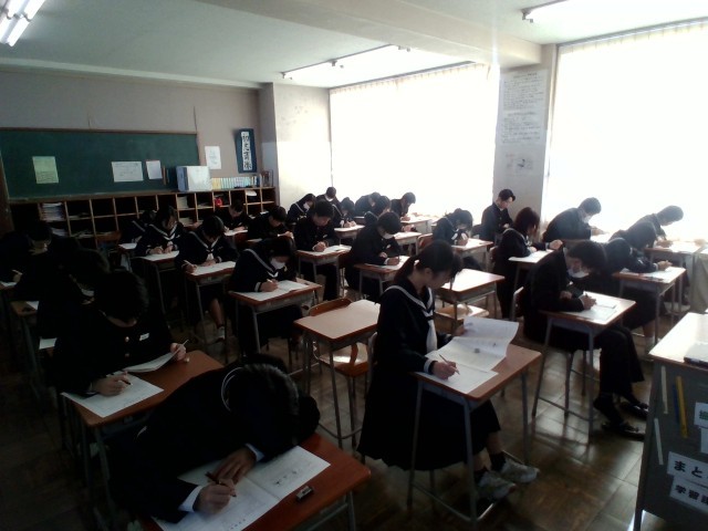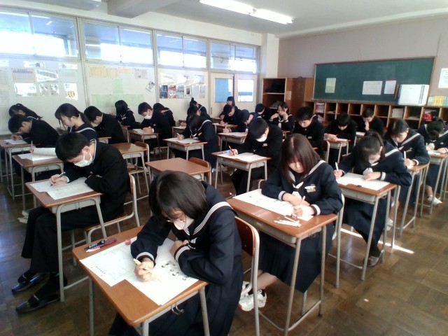 4限、英語のテストの様子(2組)です。聞き取りテストの放送に耳を傾け、真剣に問題を解いていました。