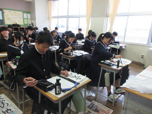 2年書き初め大会の様子です。落ち着いた雰囲気で「文学の地」を書いています。