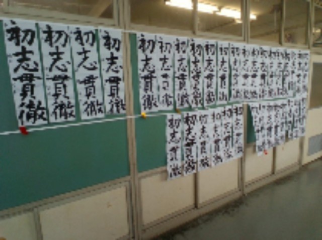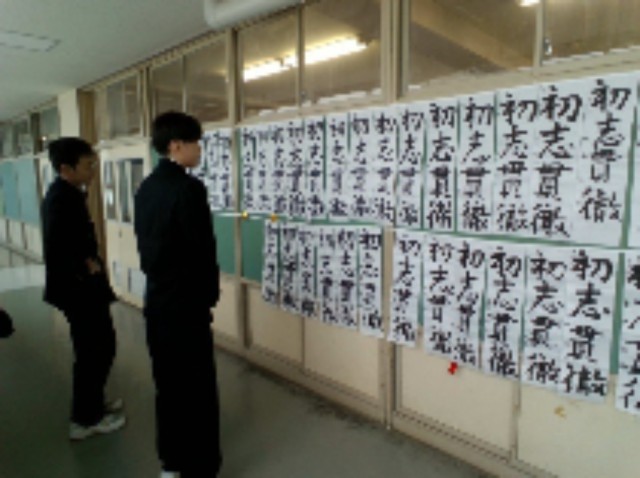 現在、廊下の掲示板には書き初めが掲示してあります。生徒は興味深そうに見ていました。