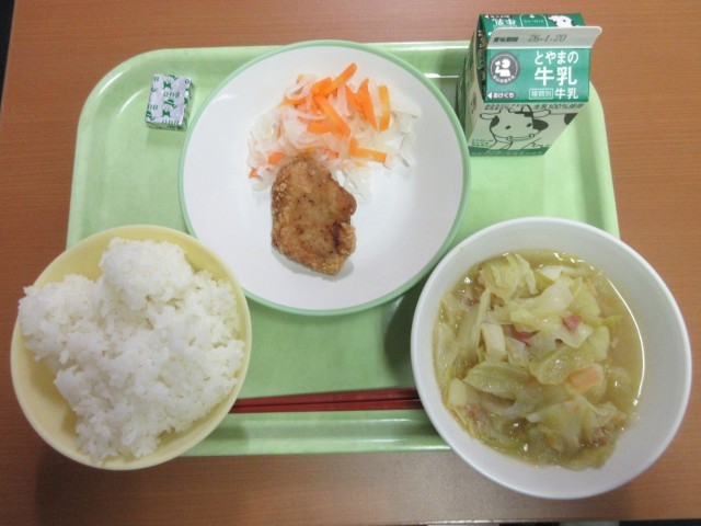 1月13日(火)今日の給食 公開日 2026/01/13 更新日 2026/01/13 給食 今日の献立は、ごはん、牛乳豚肉の香り揚げ、ピクルス野菜のスープ煮、ポケットチーズ です。スープが温かくておいしかったです。豚肉の香り揚げもおいしく、もっとたくさん食べたくなりました。