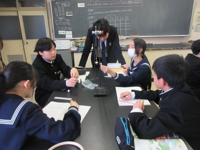 2組は理科。ばねをひく力とばねののびの関係について実験で調べています。