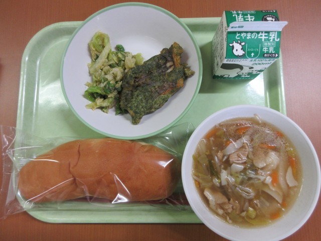 1月19日(月)今日の給食 公開日 2026/01/19 更新日 2026/01/19 給食 今日の献立は、コッペパン、牛乳ホキの磯辺揚げアスパラガスのごまだれワンタンスープ です。ホキの磯辺揚げが、量もありおいしかったです。