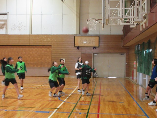 1組は保健体育。チームに分かれてバスケットボールの試合をしています。皆真剣な表情でプレイしています。