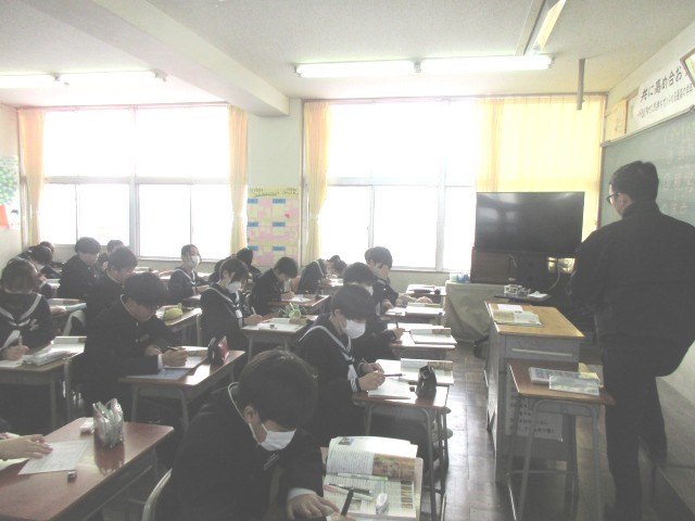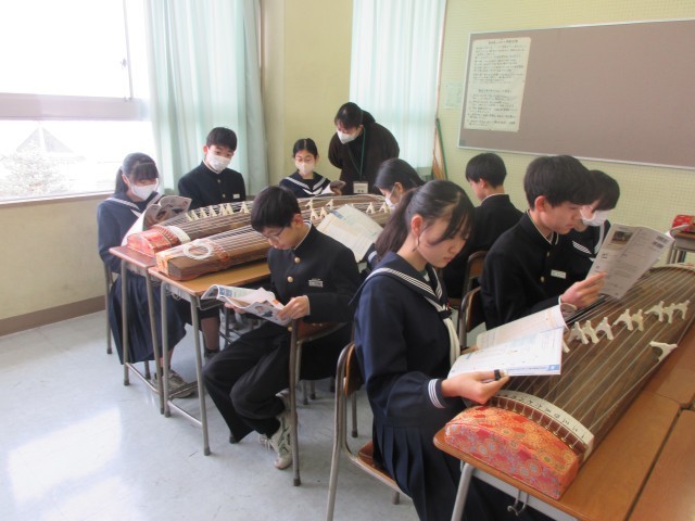 3組は音楽。1年音楽では、箏の授業が始まりました。先生の説明を聞きながら、箏の音階にチャレンジしています。