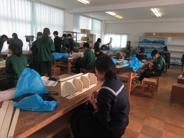 2組は技術・家庭科(技術分野)。2学期から行ってきた棚づくりも形になってきている様子です。