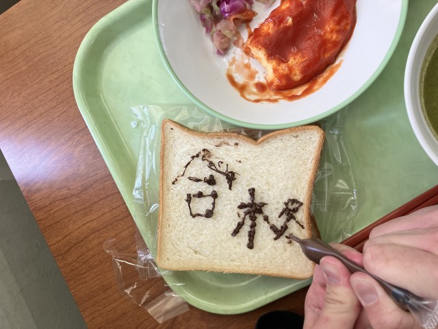 牛乳、オムレツのトマトソースかけ、紫キャベツのマリネ、ほうれん草のポタージュ、お絵かきパン です。
