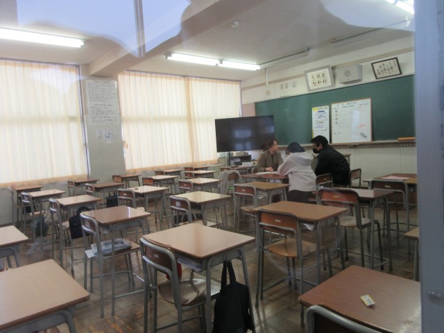 1月26日(月)3年進路懇談会 公開日 2026/01/26 更新日 2026/01/26 第3学年 23日(金)、24日(月)25日(火)の午後、3年の教室では進路懇談会を行っています。希望する生徒とその保護者の方で、主に県立高校受検について懇談を行っています。