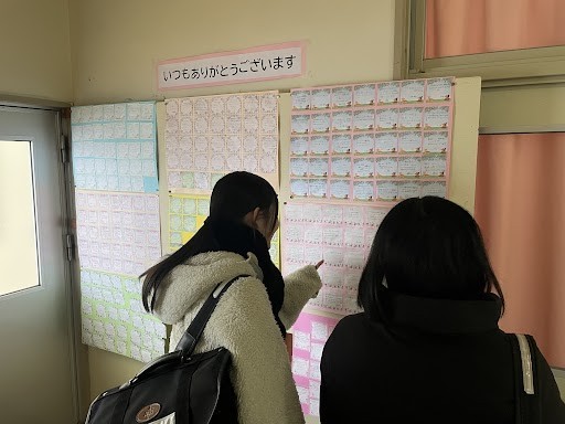 現在、配膳室前の掲示板には、生徒たちが書いた、ありがとうメッセージを掲示しています。