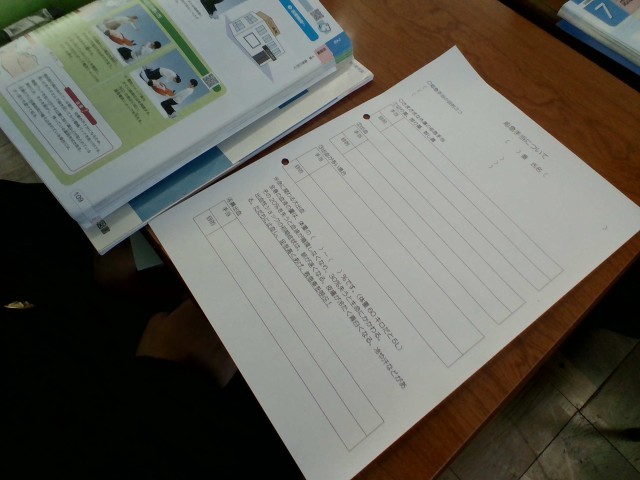 2年保健体育科では、応急手立の方法について学習しています。生徒たちは、班員と相談しながらワークシートに取り組んでいました。
