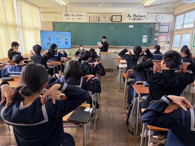 4限目に保健委員からクラスに電子メディアの利用と健康について発表しました。メディアは便利ですが、使いすぎると依存性があることや健康被害を与えることを伝えたり、また少しでも解消するためのストレッチなどをクラスみんなで実践したりしました。