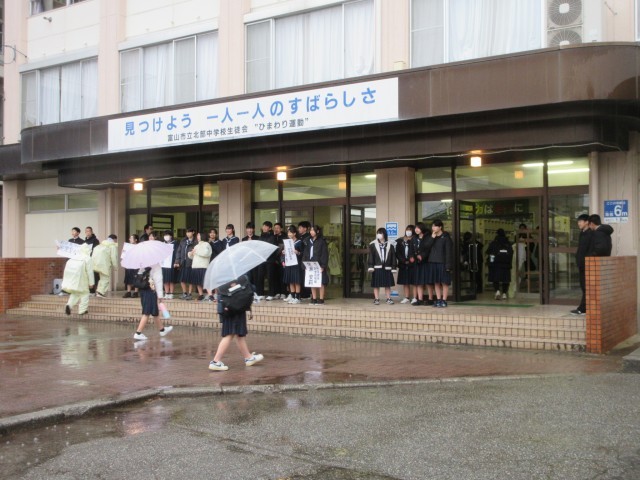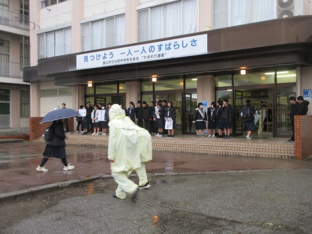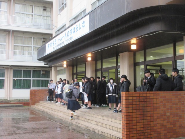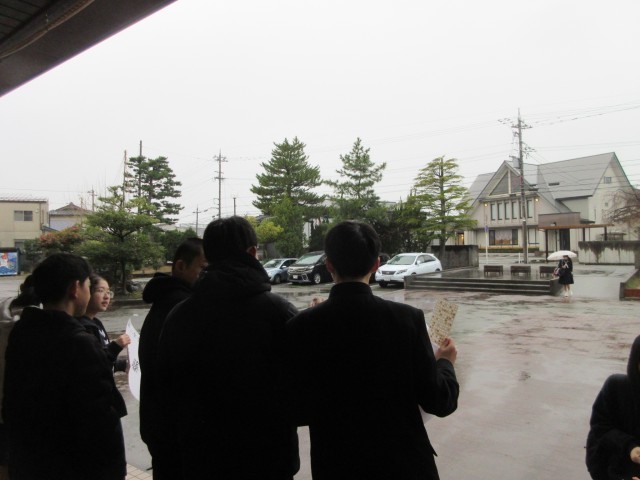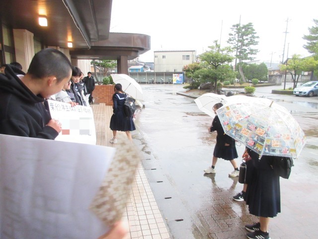 雨の朝となりました。今日も立候補者の選挙活動や挨拶運動で、生徒玄関は賑わっています。
