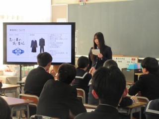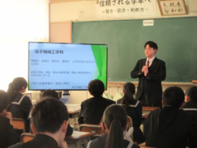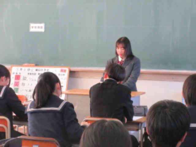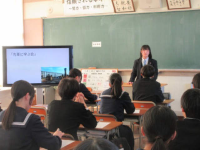 2年生は現在高校に通っている北中生の先輩方9人に来ていただき、先輩に学ぶ会を行いました。3人ずつ、順番にクラスを回ってもらい、いろんな学校のことを聞きました。