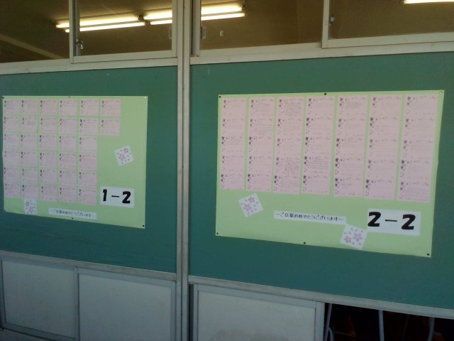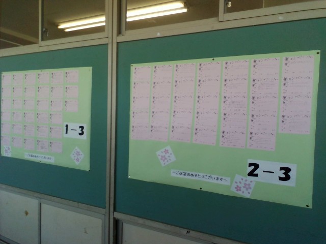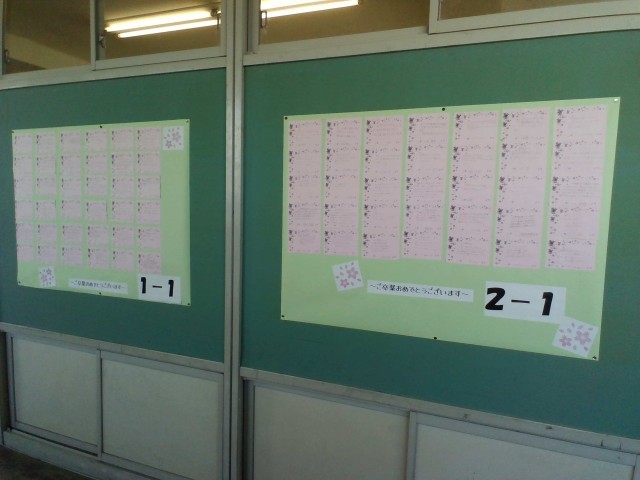 1,2年生が3年生に向けて書いた感謝のメッセージが、3年教室前廊下に掲示してあります。卒業まであとわずかになりました。みんなの思いを胸に卒業式を迎えます。