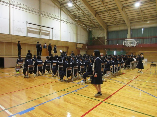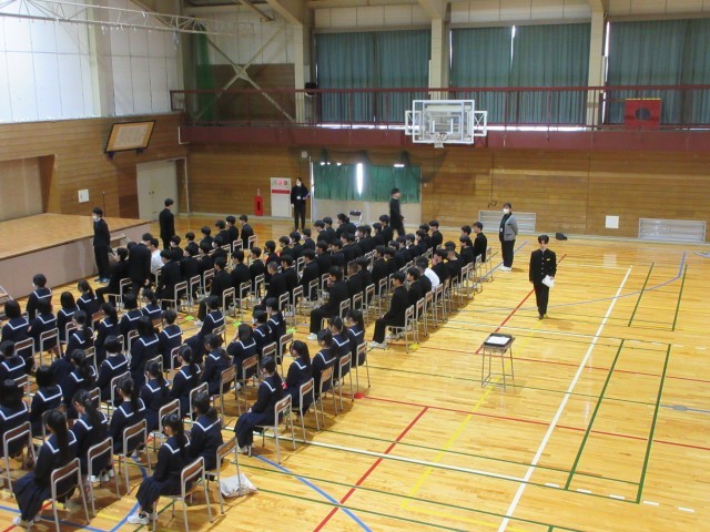 その後、卒業生の席の後ろを大きく回ります。男子は中央の通路から、女子は女子全体の席を大きく回って左から列に入って自席に戻ります。