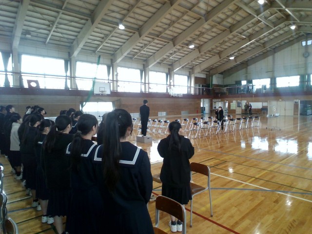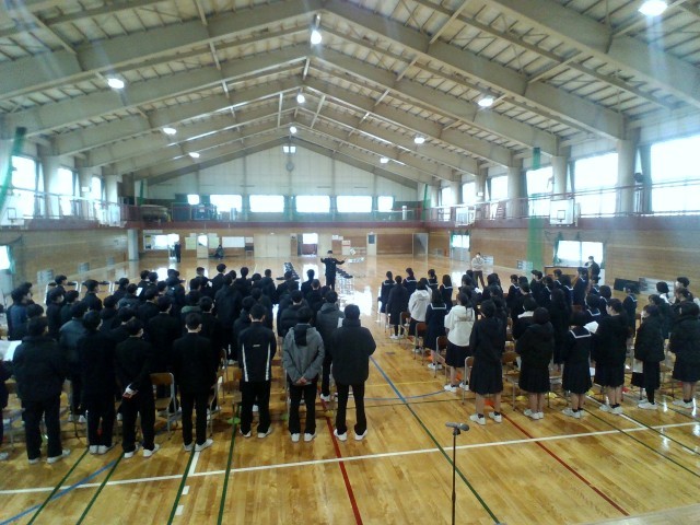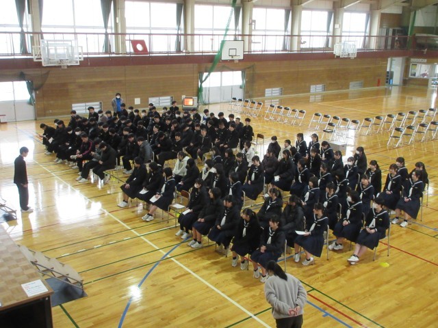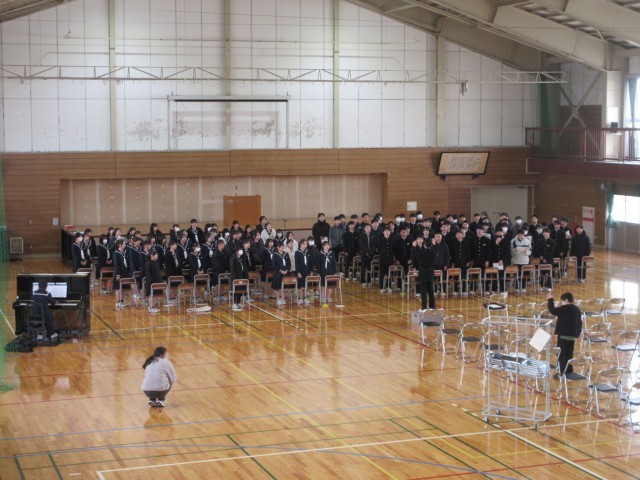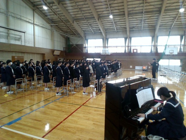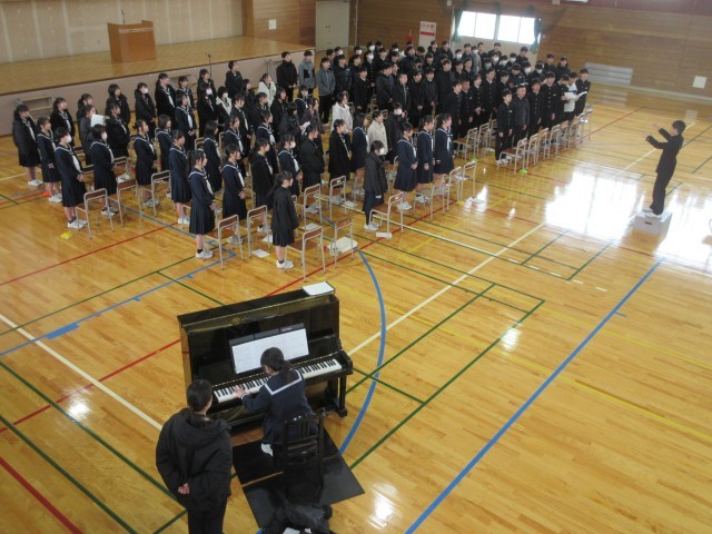 3年生、4限目は式歌練習。「群青」というこの曲は、福島県南相馬市立小高中学校平成24年度の卒業生と先生によってつくられた曲です。彼らが1年生のときに発生した東日本大震災。その困難を乗り越え、その思いを表すためにつくった卒業のための合唱曲です。3年生は、この歌に自分たちの気持ちを重ねて歌います。今日は、全員で合わせました。生徒たちは、それぞれの思いを胸に歌っていました。卒業式でも素敵な歌声となりそうです。