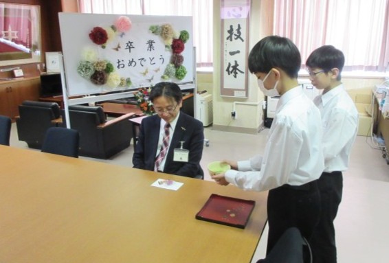 茶道部の様子です。今日は、今年度最後の活動でした。部員たちは、お世話になった校長先生と教頭先生にお茶を点てました。また、部長が校長先生に来年度に向けての抱負を話していました。