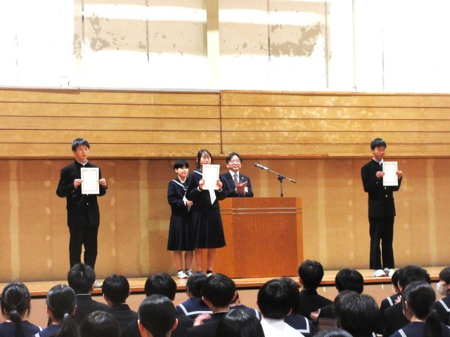 まずは、先日行われた選挙により選出された生徒会長と2名の副会長に校長から認証書を渡しました。