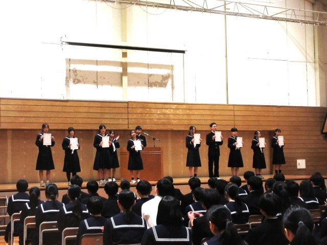 続いて、生徒会長から、生活、学習、図書、広報、美化・福祉、保健、給食の各新委員長に委嘱状を渡しました。