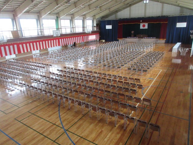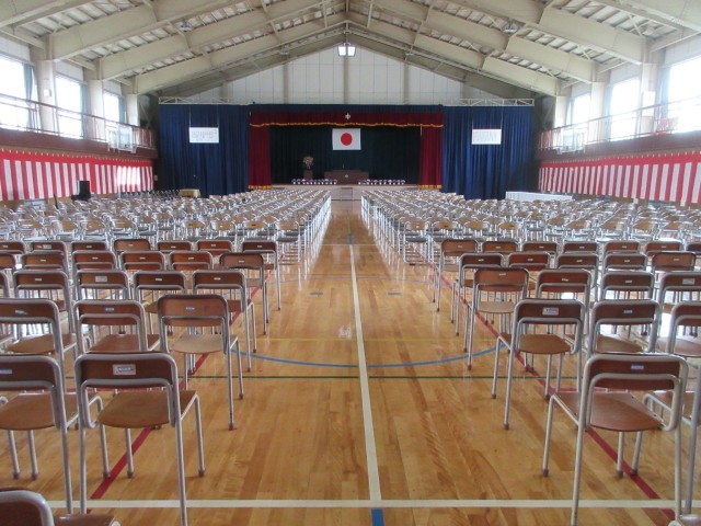 午後には、生徒たちが分担して、幕を吊ったり、いすを並べたりして式場を整えました。また、教室では、机椅子の点検や教科書等配布物の確認などを行いました。会場内の座席は、ステージ前が新入生(左が女子、右が男子)、体育館中央が保護者席、後方が2年生、3年生の座席です。