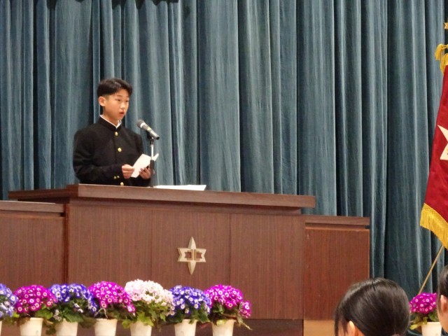 新たな出会いを大切に、共に高め合い挑戦し続ける人間関係を築いていきたい。北部中学校の生徒としての誇りをもち、学習や部活動などあらゆることに全力で挑戦し、充実した三年間を過ごすことを誓います。