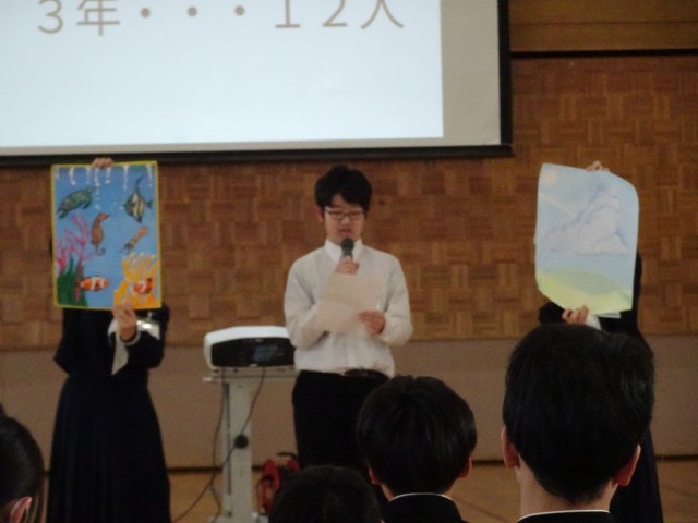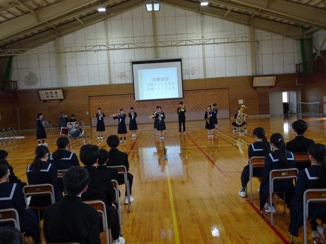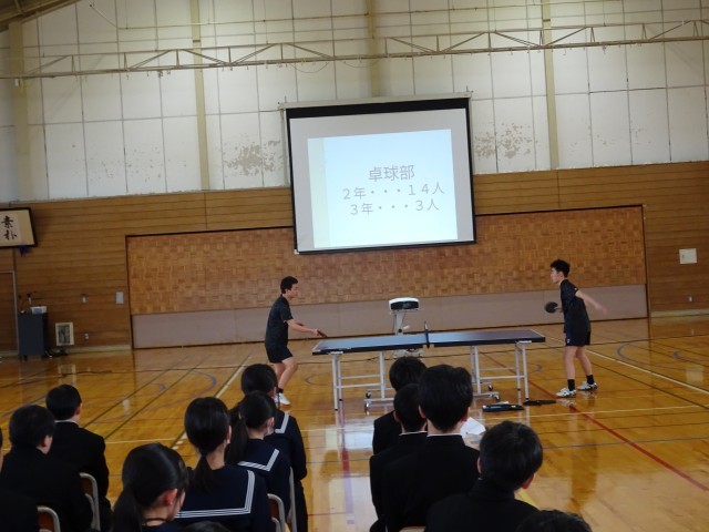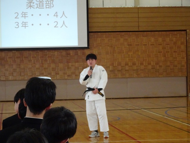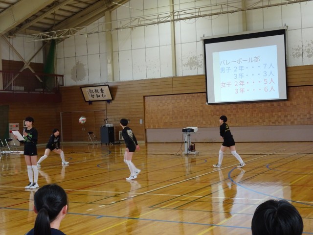 男女バレーボール、卓球、柔道、吹奏楽、作品創作、茶道がそれぞれ工夫を凝らした紹介を行いました。