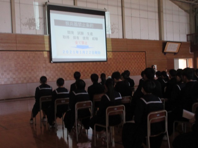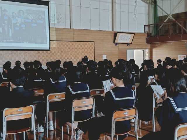 3年生の修学旅行まで、あと1か月となりました。これまで取り組んできた平和学習が、広島での活動で有意義なものとなるように講話を聴きました。