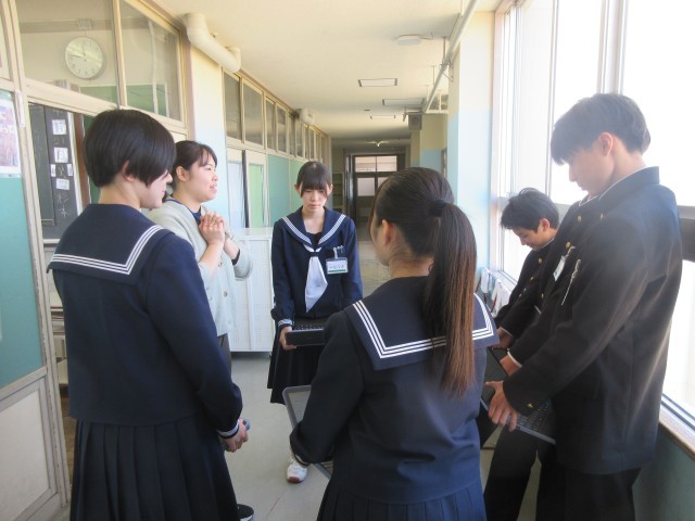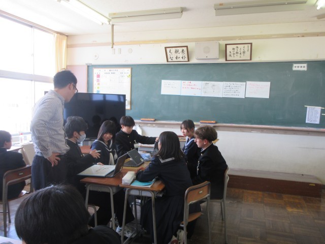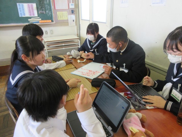 2年授業風景、各クラス学級目標を考えています。班ごとに案を出し合って、ホワイトボードに書いて発表したり、班長を中心にグループで話し合いをしています。