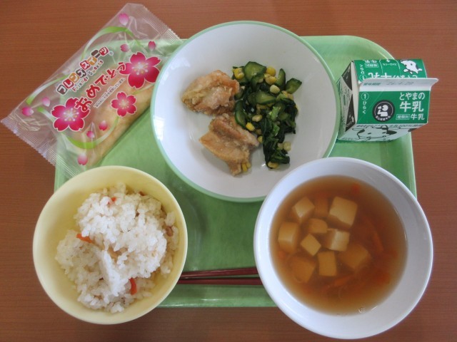 ちらし寿司、牛乳、鶏肉のから揚げ、コーン和え、すまし汁、お祝いデザート です。