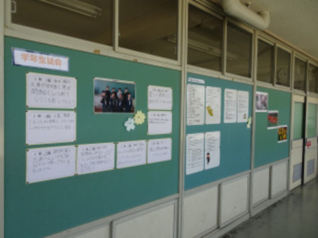 1年生の廊下に学年生徒会の掲示物がありました。それぞれの意気込みが書いてありました。