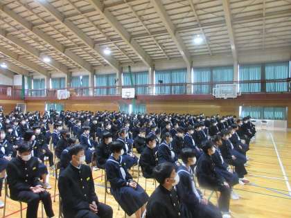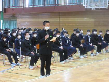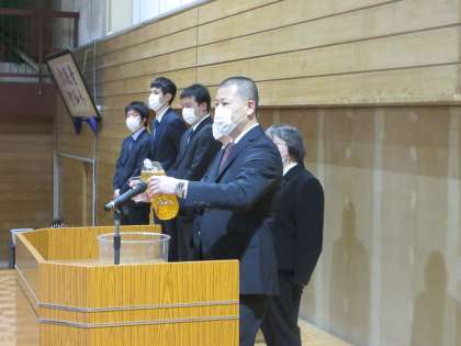 離任式(その3) 公開日 2021/04/06 更新日 2021/04/06 北中NEWS 池淵教頭先生から、 「誰もがもっている『心のコップ』をいつもまっすぐにし、周りの人からいただく愛情や指導をコップいっぱいに注ぎ、自分を大切にしましょう。」 とお話しいただきました。 代表生徒が謝辞を述べました。