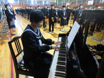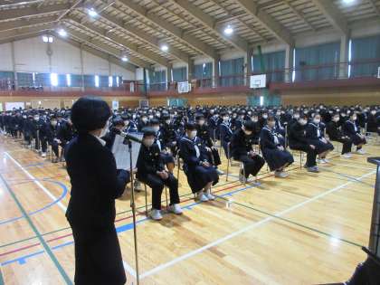 始業式(その2) 公開日 2021/04/06 更新日 2021/04/06 北中NEWS 式辞では、「誰にでも気軽に挨拶が出来る北部中学校を目指すことと、この区切りのチャンスを生かして、新しい自分、新しい北部中学校をつくりましょう」と話しました。 新しい担任等の発表を行い、その後、校歌を斉唱しました。