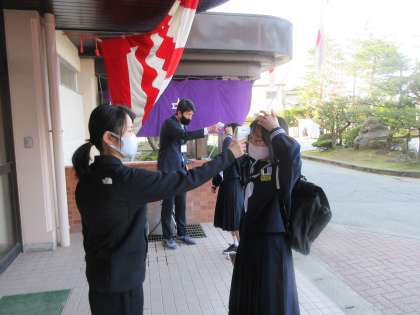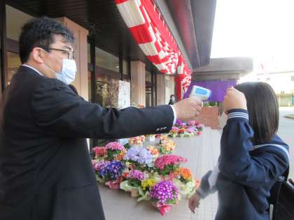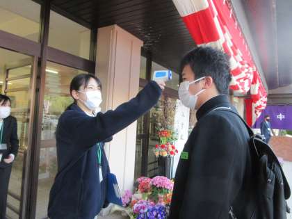 校舎に入る前に、玄関で検温を行います。 「はい、おでこ出して!!よし、元気!!」