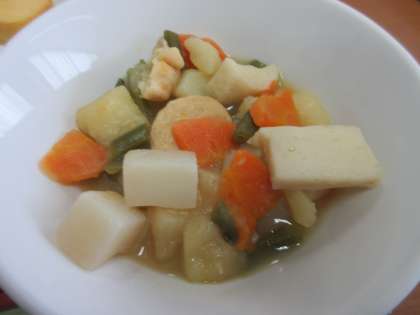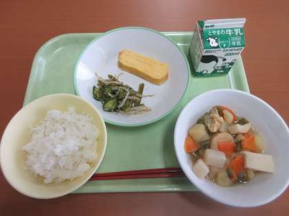 関東だきは、じゃがいもがとけてうまみばっちり!! ごはん 牛乳 厚焼き卵 茎わかめのごま酢和え 関東だき