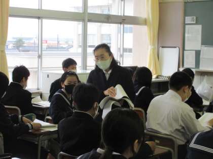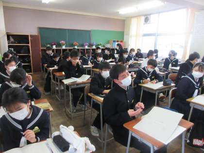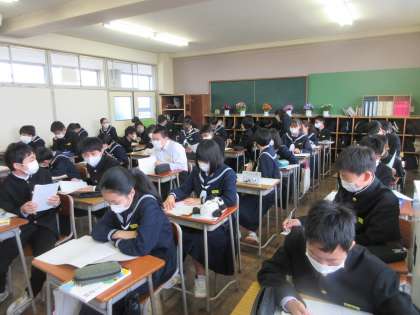 国語の授業です。 先日の中教研学力調査の答案を返しました。 「どうだったぁ!?」「う〜ん、まあまあかな・・・。」
