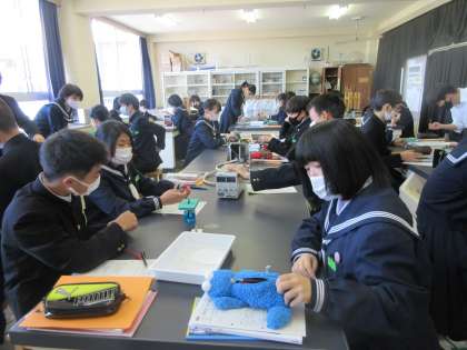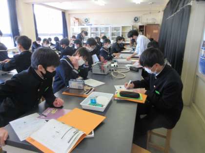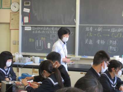 理科の授業です。 塩化銅水溶液に電流を流すと水溶液の中でどんな変化が起こるのかを実験しました。