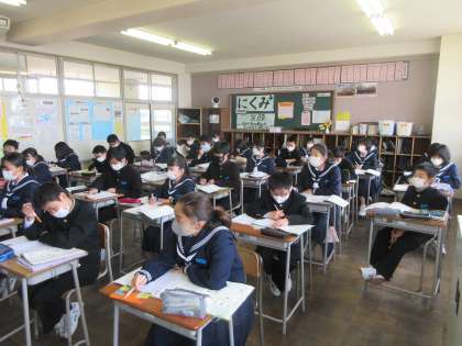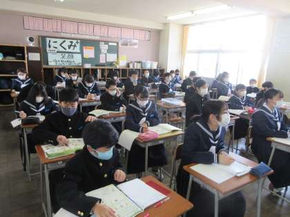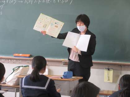 英語の授業です。 教科書とワーク、ノートの使い方を説明しました。