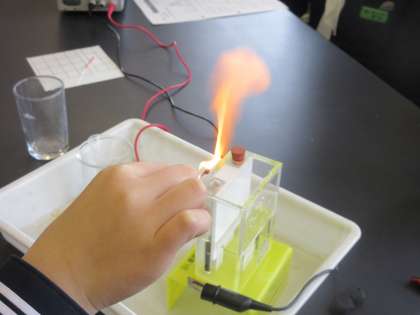 3−1(その2) 公開日 2021/04/30 更新日 2021/04/30 第3学年 陽極の気体にマッチを近付けると・・・ 「ぼっ!!」・・・火が付きました。 「おお〜、こっちに水素が集まったんだぁ!!」