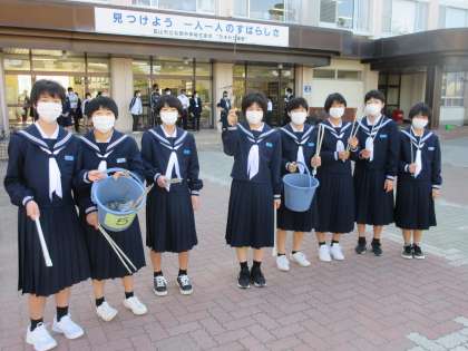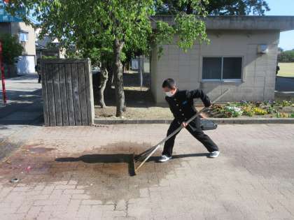 女子バレーボール部1年生と野球部1年生が、ごみ拾いや水取を行いました。