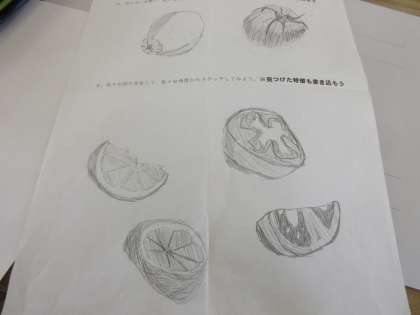 美術の授業です。 野菜や果物の特徴を生かして、新しい形をつくります。