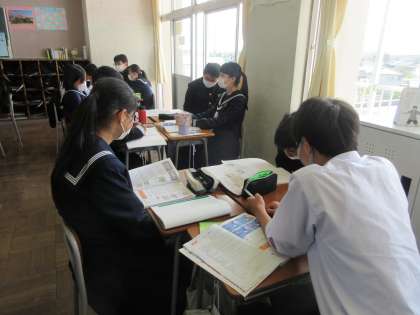 理科の授業です。 身のまわりのものを持ち寄って、万能ph試験紙で酸性・アルカリ性の強さを調べます。